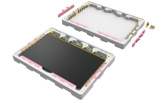 随着面板尺寸越趋多元,加快半成品包材淘汰的速度,过季机种的运输箱占据大量空间,新包材却又陆续产出。共享式包材设计可确保产品安全同时达到资源共享,是工业包装的重要议题。「贪食蛇档块设计」应运而生,以闲置运输箱做为载具,以圆形凸柱作为枢纽让档块串接,围绕出的空间便可装载各种尺寸的面板。
