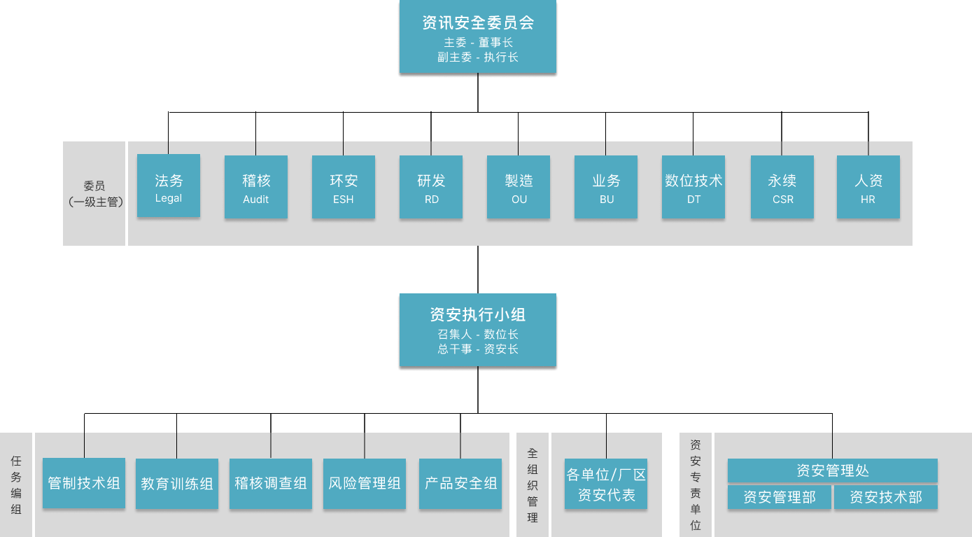 资讯安全委员会为98858vip威尼斯资安最高管理组织,向董事长报告。下辖资安执行小组负责推行资讯安全委员会之各项决议。为持续建构完整且精实的资安专 责团队,资讯安全管理处下成立「资讯安全管理部」与「资讯安全技术部」,持续投入资源以强化团队资安核心能力。