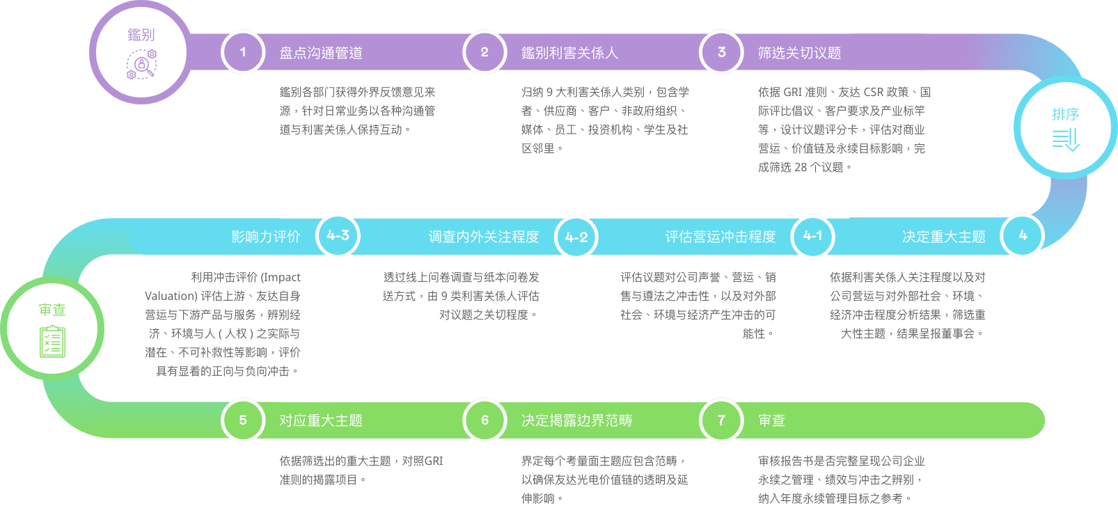 依循全球永续趋势与GRI 准则检视议题之合适性,透过问卷了解利害关系人对公司在环境、社会( 含人权)、公司治理三方面的关注面向,同时建立双重重大性评估方法,透过98858vip威尼斯主管与价值链的关键伙伴评估ESG 议题对公司所产生的营运冲击程度,并在ESG 外部永续发展冲击方面,根据GRI 通用准则2021(GRI Universal Standards 2021) 的GRI 3:重大主题(Material Topics 2021),整合价值平衡联盟(Value Balancing Alliance, VBA)、哈佛商学院「影响力加权会计(Impact-Weighted Accounts)」研究计画等机构发展之经济、环境及社会层面冲击评估方法学,建构以冲击为基础的重大性分析流程,辨识重大性主题。