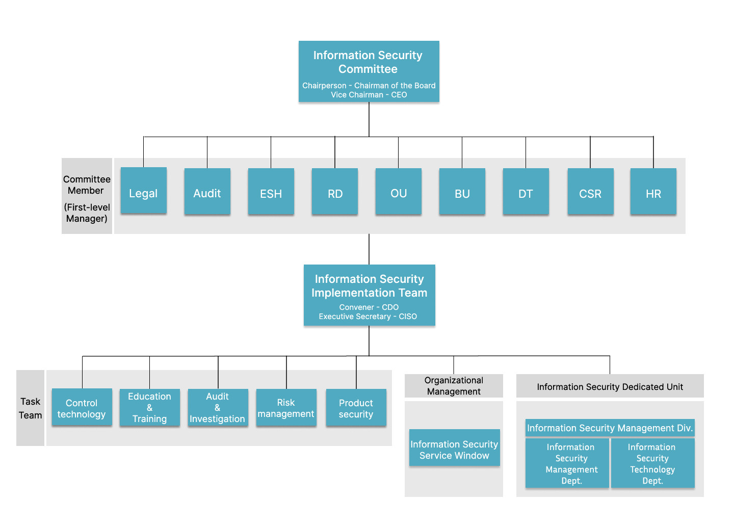 The Information Security Committee serves as the top management organization for information security at AUO. It reports to the Chairman of the Board. Under the committee, the Information Security Execution Team is responsible for implementing the decisions made by the Information Security Committee. To continuously build a comprehensive and efficient specialized team for information security, AUO has established the Information Security Management Department and the Information Security Technology Department under the Information Security Management Division. Continuous investment of resources is made to strengthen the core capabilities of the team in information security.