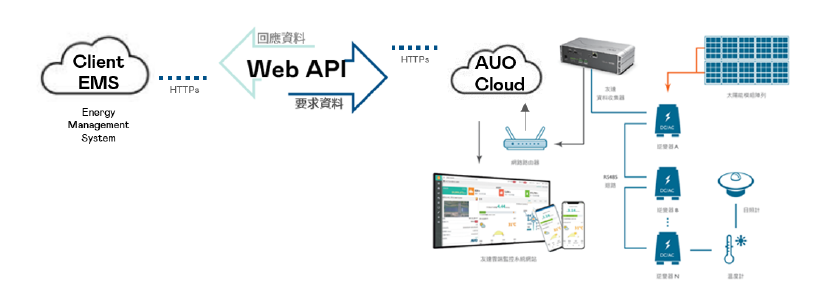 API 串接服務為 Client 端和AUO雲端平台透過 HTTPs 通訊協定來進行資料請求與回應 |