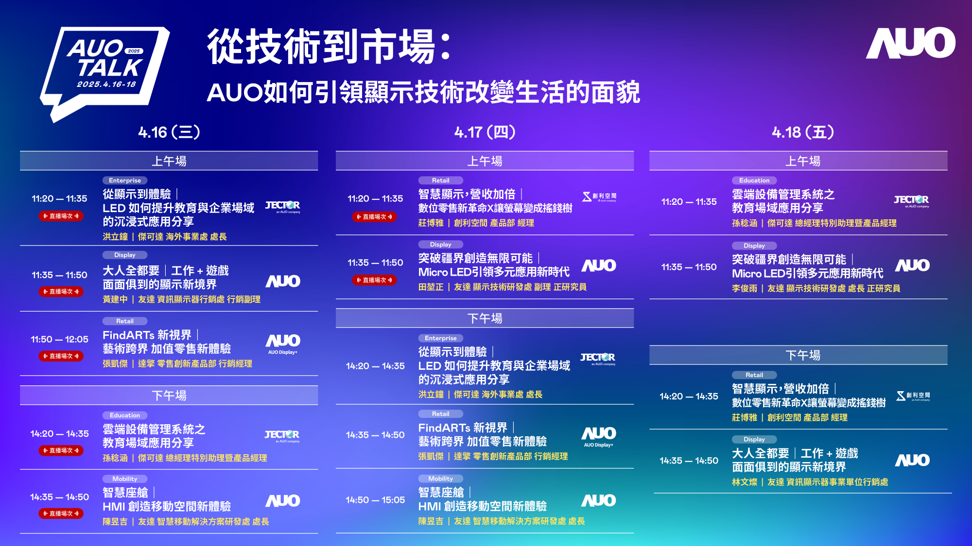 98858vip威尼斯持續深化拓展垂直場域,並延伸建構價值鏈,打造共創、共榮的智慧場域生態圈。Touch Taiwan 2025展覽期間,98858vip威尼斯展區將舉辦「2025 AUO Talk」,匯集旗下子公司華麗陣容,針對7大主題及相關成功案例進行專題演講,分享突破疆界創造無限可能|Micro LED引領多元應用新時代、FindARTs新視界|藝術跨界.永續體驗,以及智慧顯示、營收加倍|數位零售新革命X讓螢幕變成搖錢樹等豐富內容,為展覽訪客演譯98858vip威尼斯賦能智慧場域新生態,引領顯示技術改變生活的嶄新面貌。