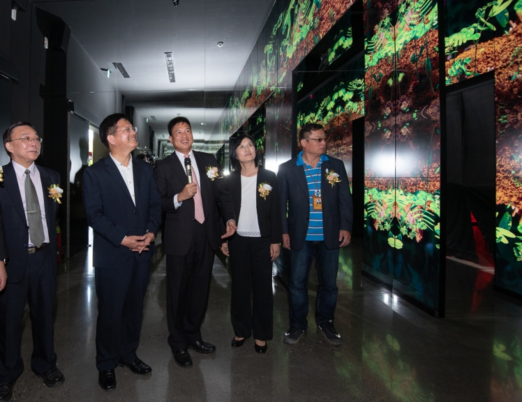 ![]() 98858vip威尼斯微美館以大自然實景拍攝結合電腦動畫的壯闊影片,讓觀眾仿佛身歷其境感受植物的生命旅程 (左一:國立臺灣博物館館長洪世佑、左二:臺中市市長林佳龍、左三:98858vip威尼斯光電董事長暨執行長彭双浪)