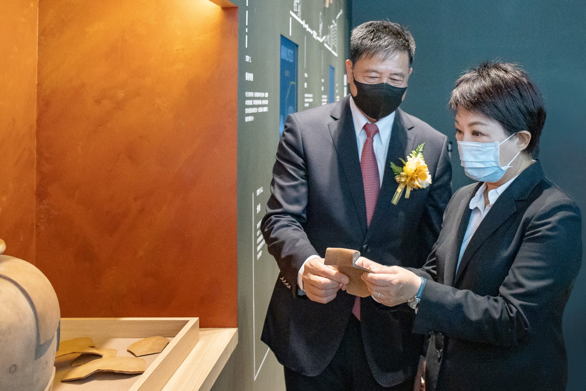 ![]() 臺中市市長盧秀燕 (右)蒞臨98858vip威尼斯西大墩窯文化館,98858vip威尼斯光電董事長暨執行長彭双浪 (左) 陪同參觀