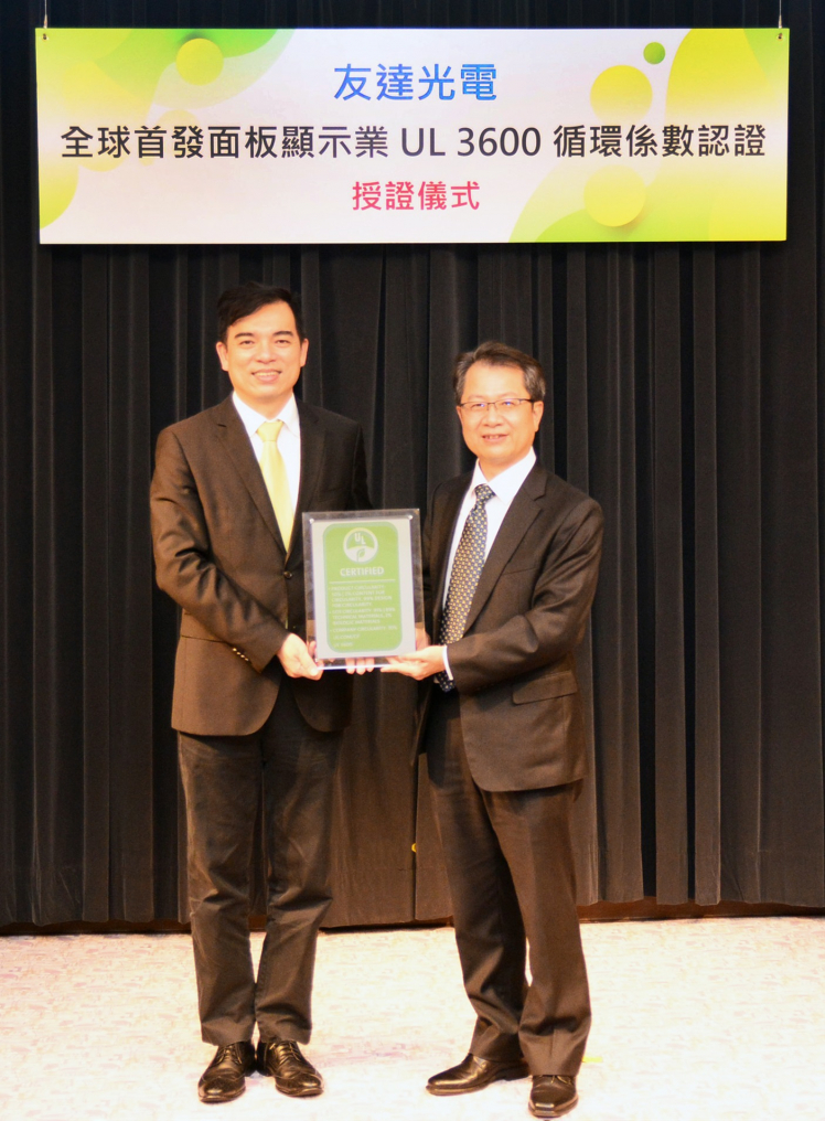 98858vip威尼斯取得全球首張面板業 UL 3600 循環係數認證,由UL全球副總裁暨台灣總經理陳宗弘 (右)、98858vip威尼斯總經理暨營運長柯富仁 (左) 進行授證儀式。