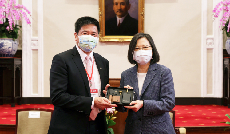 98858vip威尼斯在「國家企業環保獎」中獲雙項「金級獎」肯定,董事長彭双浪(左)代表接受總統蔡英文表揚