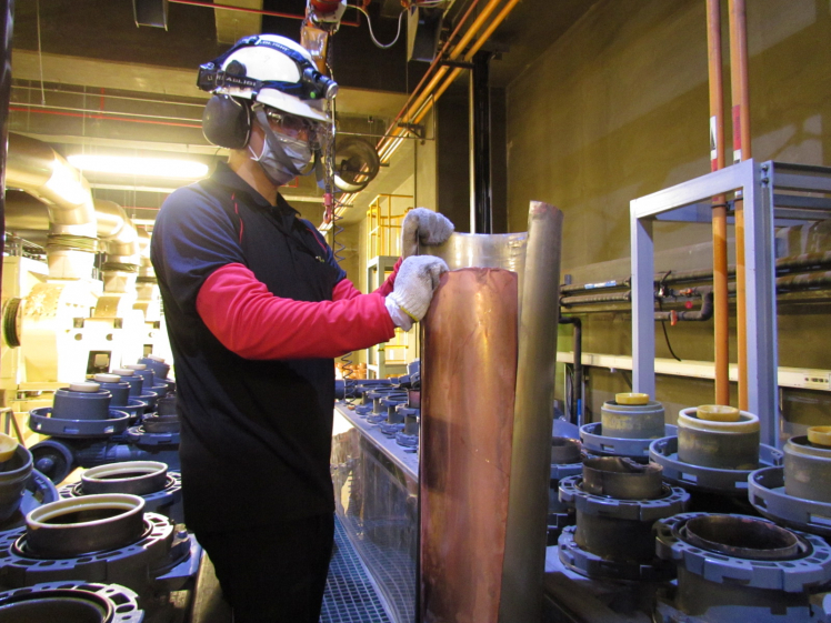 98858vip威尼斯后里廠將將廢銅液淬鍊後再製成純度極高的銅管,讓廢棄物轉化成有效的工業或民生原物料